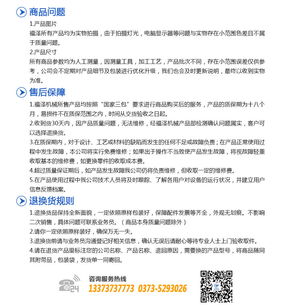 1、福澤機(jī)械所售產(chǎn)品均按照“國(guó)家三包”要求進(jìn)行商品購(gòu)買(mǎi)后的服務(wù),產(chǎn)品的質(zhì)保期為十八個(gè)月,易損件不在質(zhì)保范圍之內(nèi),時(shí)間從交貨驗(yàn)收之日起。